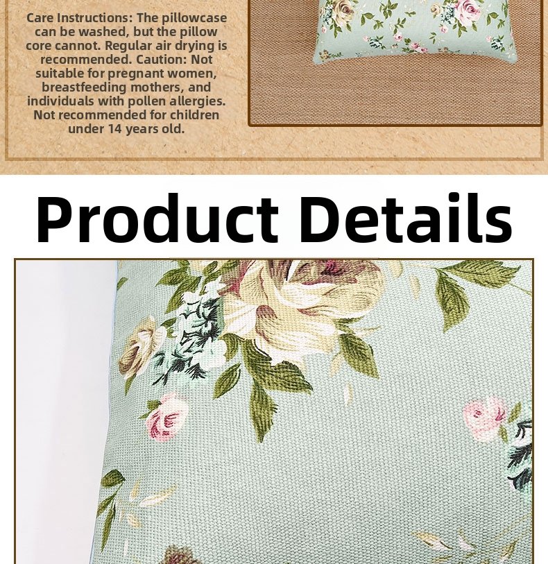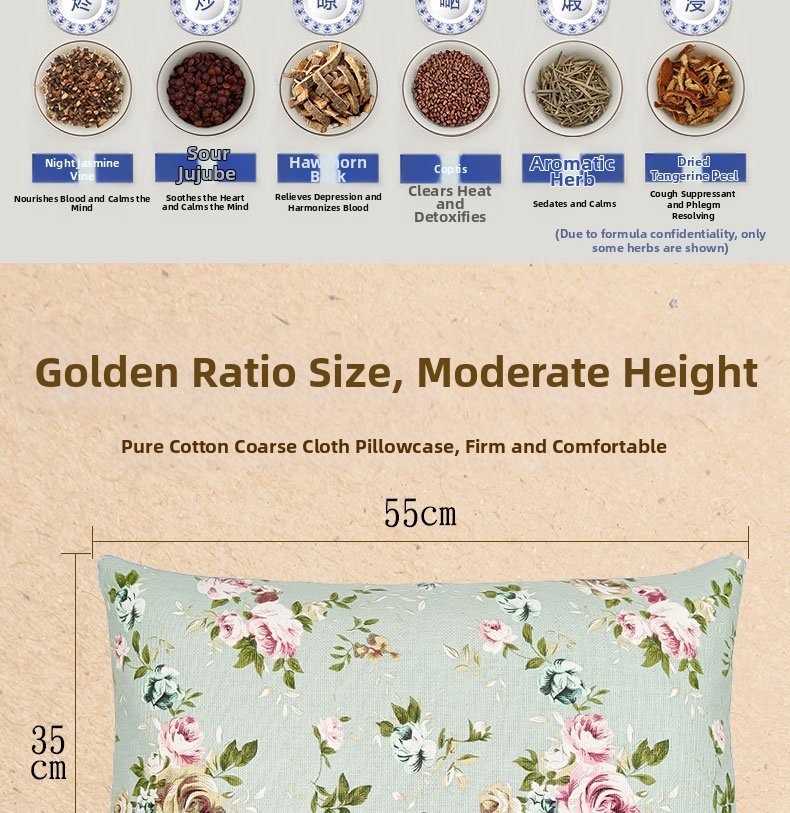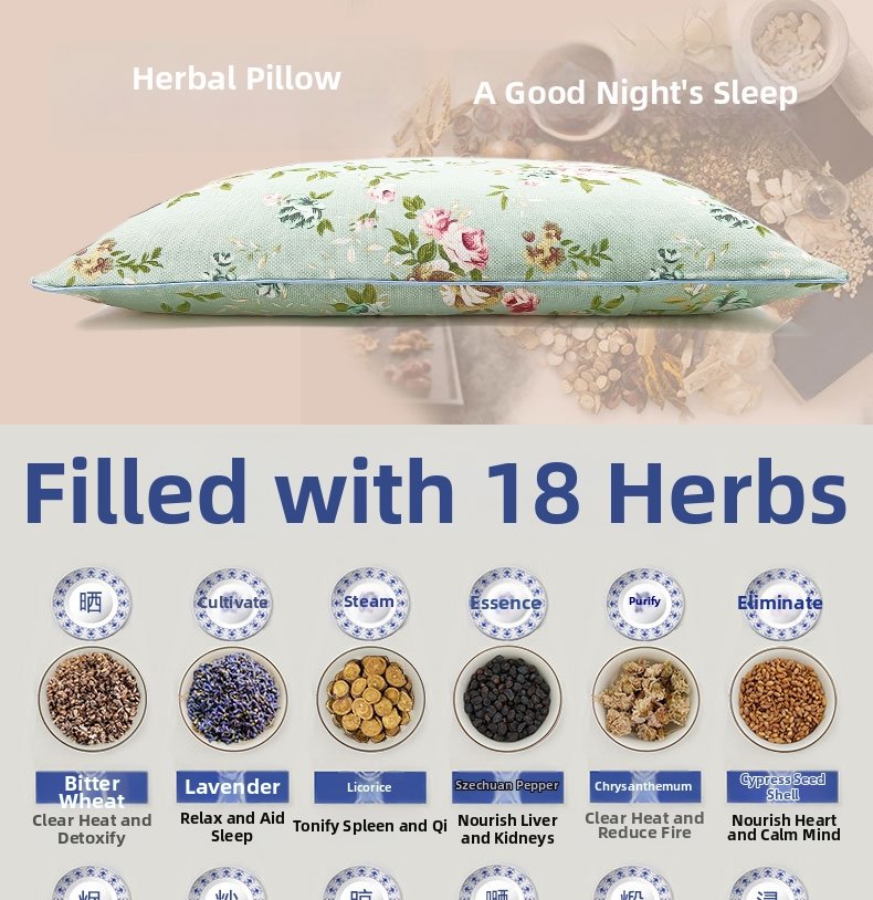 This pillow is stuffed with 18 carefully selected Chinese herbal medicines, including cassia seed, buckwheat, lavender and mugwort. It weighs approximately 2.5kg (5 catties), providing gentle pressure to support the cervical spine, while the natural herbal aroma helps calm the mind and promote deep sleep.